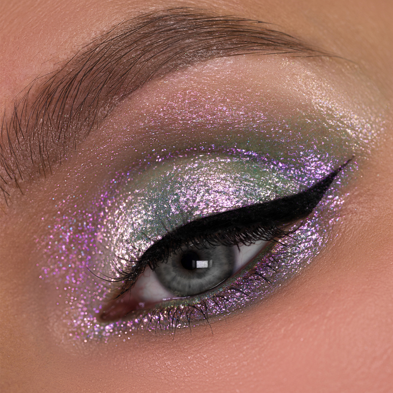 Переливающийся разнодисперсный 3D-глиттер создает на веках тончайшее, одновременно объемное металлическое и дуохромное сияние, зависимо от выбранного оттенка. Создают на веках мерцание, особенно выигрышно смотрится при искусственном освещении.