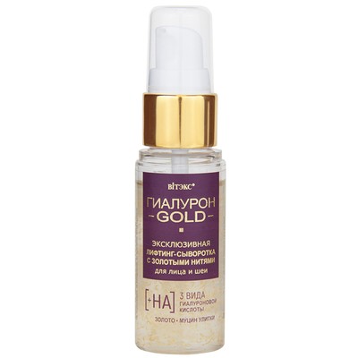 Золотые нити показали невероятную эффективность для быстрых видимых результатов в омоложении кожи, разглаживании морщин и подтягивании овала лица. В научном центре компании ВИТЭКС была создана эксклюзивная лифтинг-сыворотка с золотыми нитями – безопасная и по-настоящему действенная альтернатива инъекционным методам омоложения.