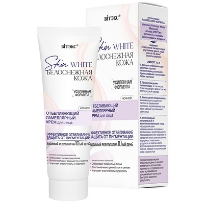 Мощное отбеливающее действие против пигментации различного происхождения, веснушек и пятен постакне Предупреждение пигментации, в том числе появляющейся с возрастом и в послеродовой период Уменьшение покраснений, минимизация сосудистой сеточки и проявлений купероза, выравнивание тона кожи, свежий и ухоженный цвет лица Интенсивный питательный и восстанавливающий уход: насыщение кожи незаменимыми липидами и витаминами, предотвращение преждевременного старения и увядания кожи, разглаживание морщинок, повышение упругости и эластичности, восстановление естественного сияния, свежая и отдохнувшая кожа каждое утроВысокоактивный комплекс Premium White (Melаvoid) оказывает мощное отбеливающее действие против пигментации всех видов, в том числе возрастной, а также веснушек и пятен постакне, обеспечивая видимый эффект уже на 10 день* применения.